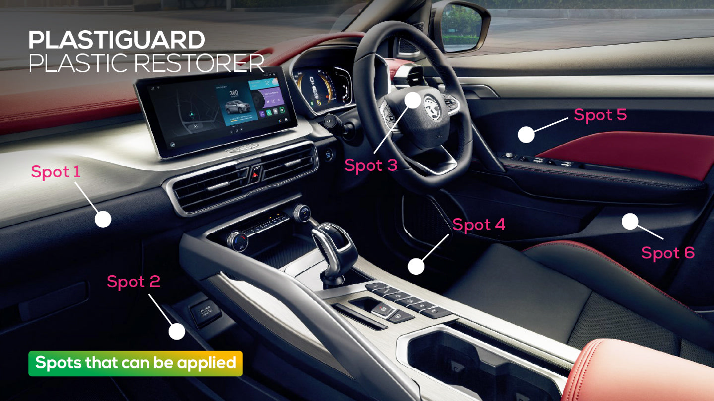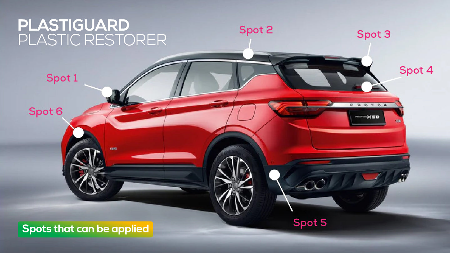 Wash your vehicle car plastic thoroughly with water, leave it dry. Spray 1-3 times of Plastiguard Car Coating on the sponge provided and wipe it evenly on the car exterior plastic.